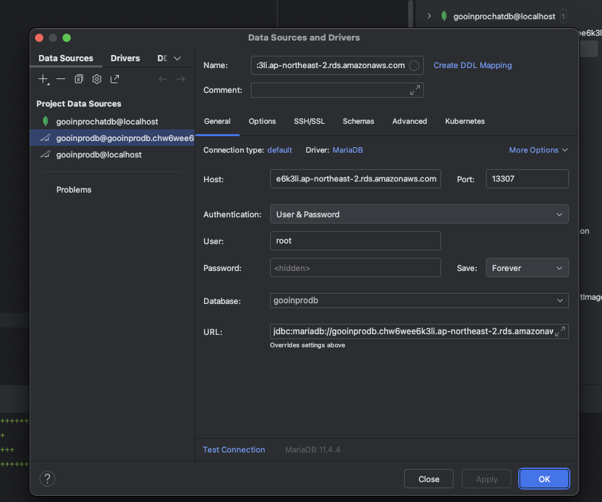 rds에 맞게 유저 생성 필요, @뒤에는 localhost 대신 rds 엔드포인트로 작성