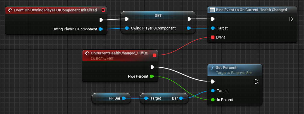 DECLARE_DYNAMIC_MULTICAST_DELEGATE_OneParam(FOnPercentChangedDelegate, float, NwePercent); class IInteractablePropInterface; UCLASS() class BOSSFIGHT_API UPlayerUIComponent : public UPawnUIComponent { GENERATED_BODY() // ์ค๋ต UPROPERTY(BlueprintAssignable) FOnPercentChangedDelegate OnCurrentHealthChanged; };์์ ๊ฐ์ด ๋ธ๋ฆฌ๊ฒ์ดํธ๋ฅผ ์ ์ธํ๊ณ , UPROPERTY(BlueprintAssignable)์ ํตํด ๋ธ๋ฃจํ๋ฆฐํธ์์ ํ ๋น ํ ์ ์๋๋ก ํ์๋ค.