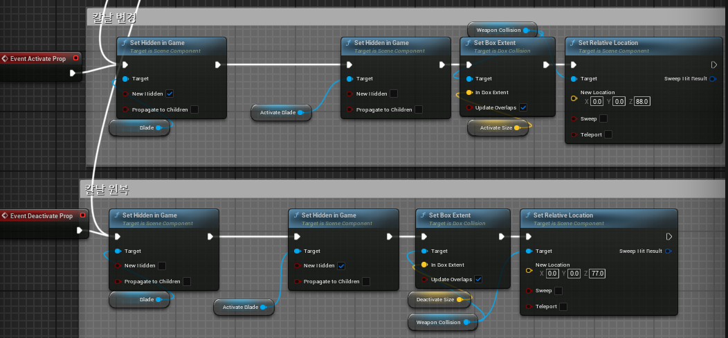 void UBFPlayerAnimInstance::NativeThreadSafeUpdateAnimation(float DeltaSeconds) { Super::NativeThreadSafeUpdateAnimation(DeltaSeconds); if (OwningPlayerCharacter) { bIsEquipWeapon = UBFFunctionLibrary::NativeDoseActorHaveTag(OwningPlayerCharacter, BFGameplayTag::Player_WeaponEquip); } }위와같이 bIsEquipWeapon변수를 추가하여 Tag를 검사해 무기를 장착 중인지 확인 할 수 있게 하였다.