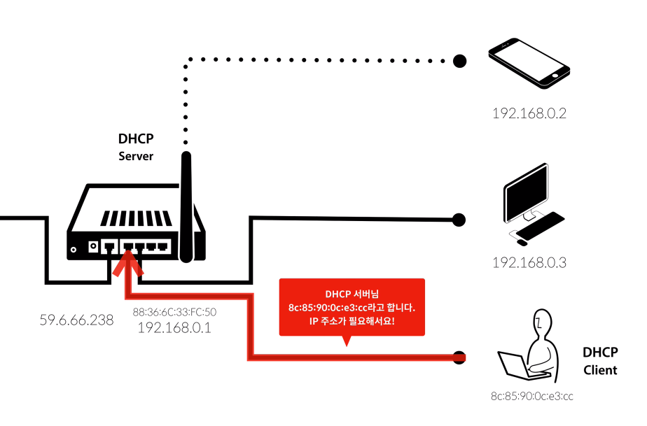 1. 공유기에 노트북을 LAN으로 연결하면 자동으로 DHCP Client가 DHCP Server에게 IP주소를 요청한다.