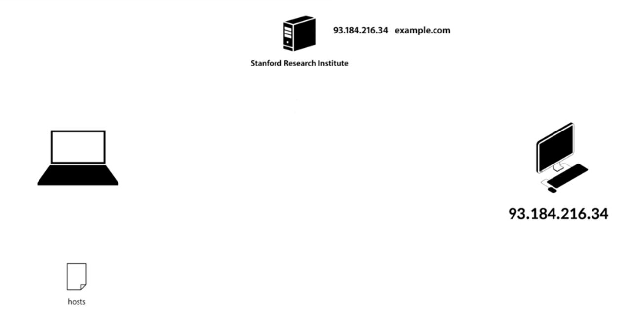 DNS 이전에는 'Stanford Research Institute(SRI)'라는 단체에서 전 세계 IP를 관리했었으며 모든 client는 SRI에 접속해서 도메인/IP주소의 정보를 가져와 hosts파일에 기록 후 접속을 했다.