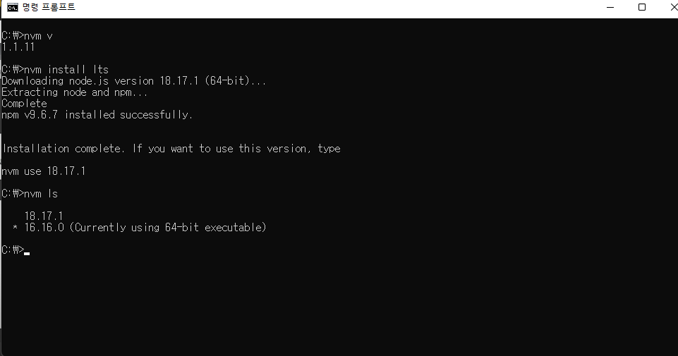 nvm install lts ////// LTS version 설치(18.17.1)