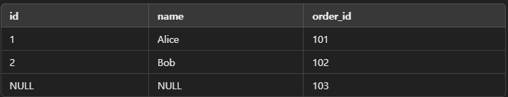 orders 테이블의 모든 데이터가 반환되며, customers 테이블에 일치하는 고객이 없으면 name과 같은 값들이 NULL로 반환된다.