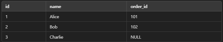 customers 테이블의 모든 데이터가 반환되며, orders 테이블에 일치하는 주문이 없으면 order_id는 NULL이 반환된다.
