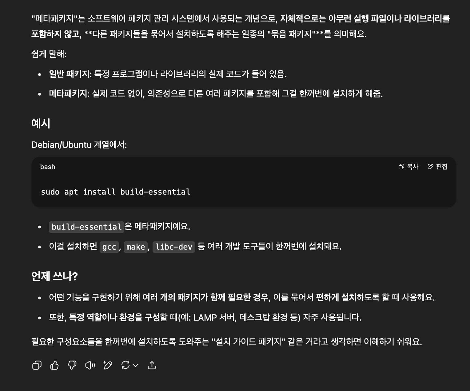 "종속성만 정의되어 있는 껍데기 패키지"를 사내 저장소에 배포해놓으면 쉽게 참조해서 쓸 수 있지 않을까 싶었는데 이런 형태를 meta-package라 부른다는 걸 챗지피티를 통해 알게 되었다.