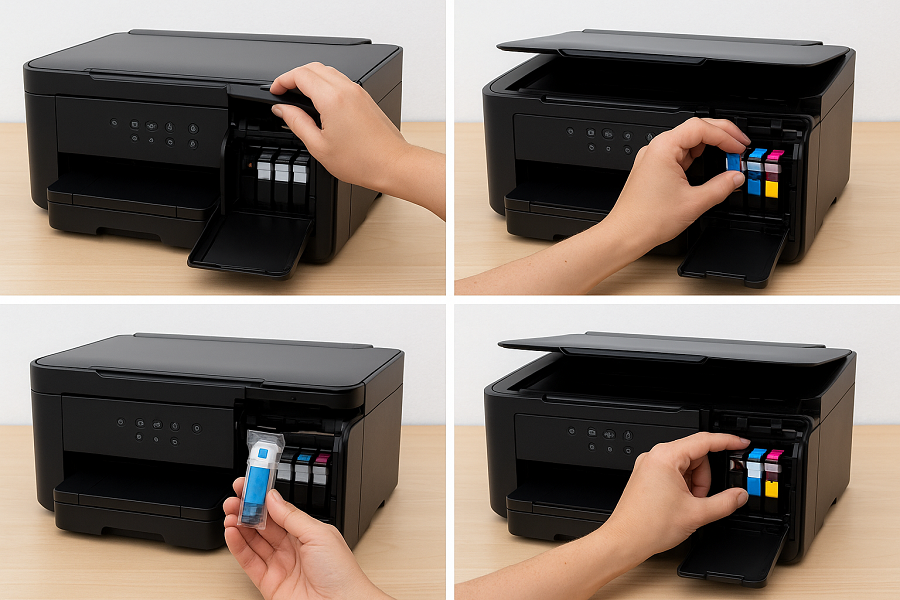 Before opening the new ink cartridge, give it a little shake. Take off any seals or protective tape. When the cartridge snaps into position, insert it into the slot. Check the color guide on your printer to see which slot each color belongs in.