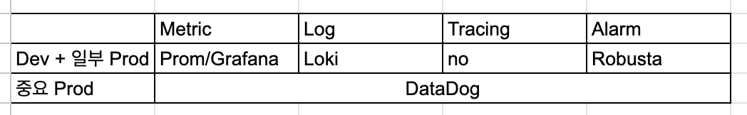 - 다시 구축한다면 기존 경험이 중요할 듯. 데이터독 경험이 있다면 동일하게 중요 Prod 환경은 데이터독으로 가고 이 외 개발, 중요하지 않는 운영 환경(만약 분리되어 있다면)은 Prom, Loki 등의 오픈소스 조합으로 갈 것 같다.