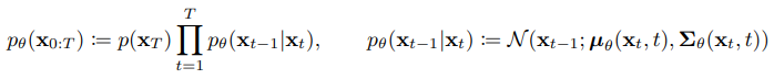 위 식에서, 각 단계의 정규 분포의 평균 uθ 표준편차 Σθ는 학습되어야 하는 파라미터