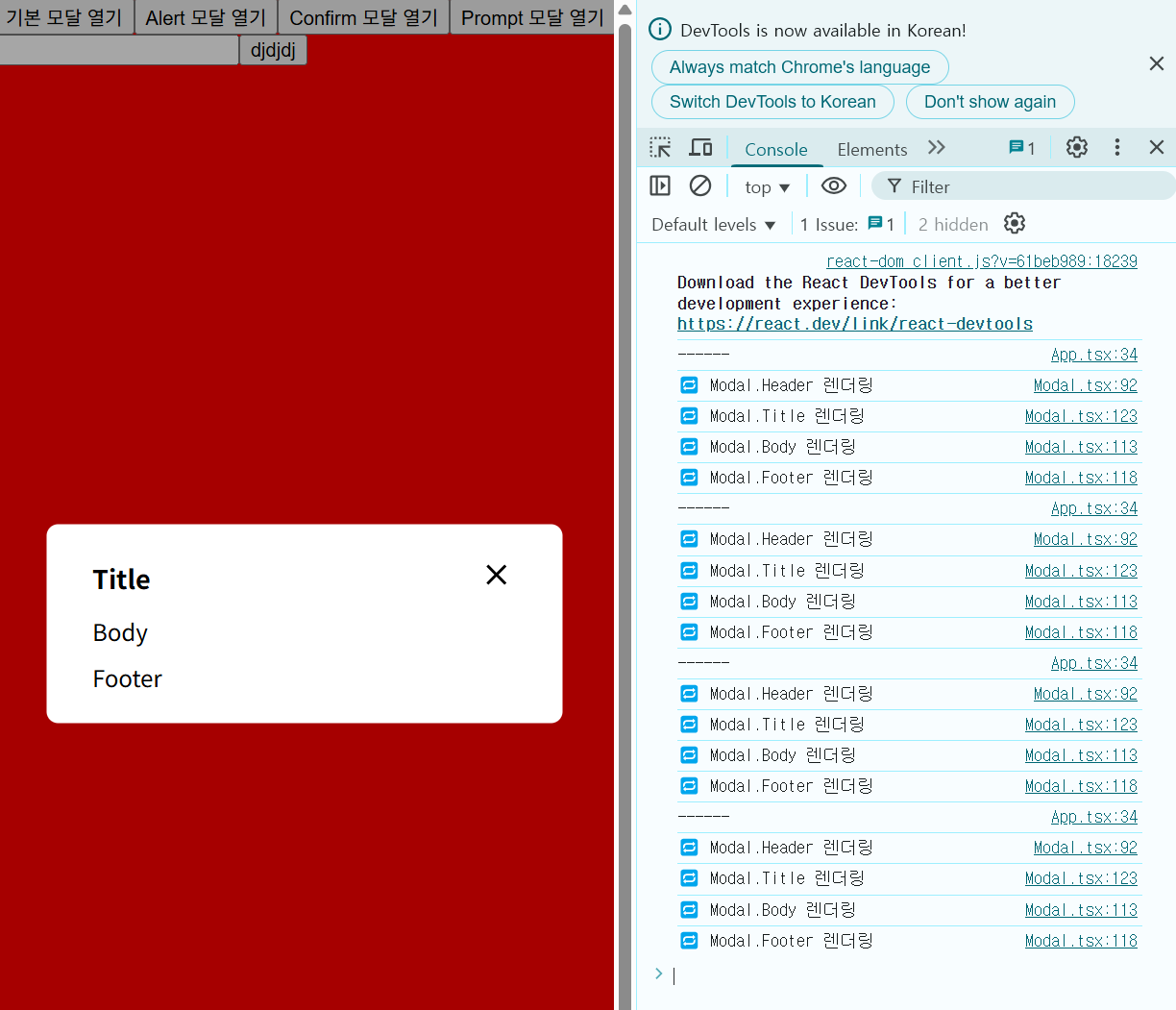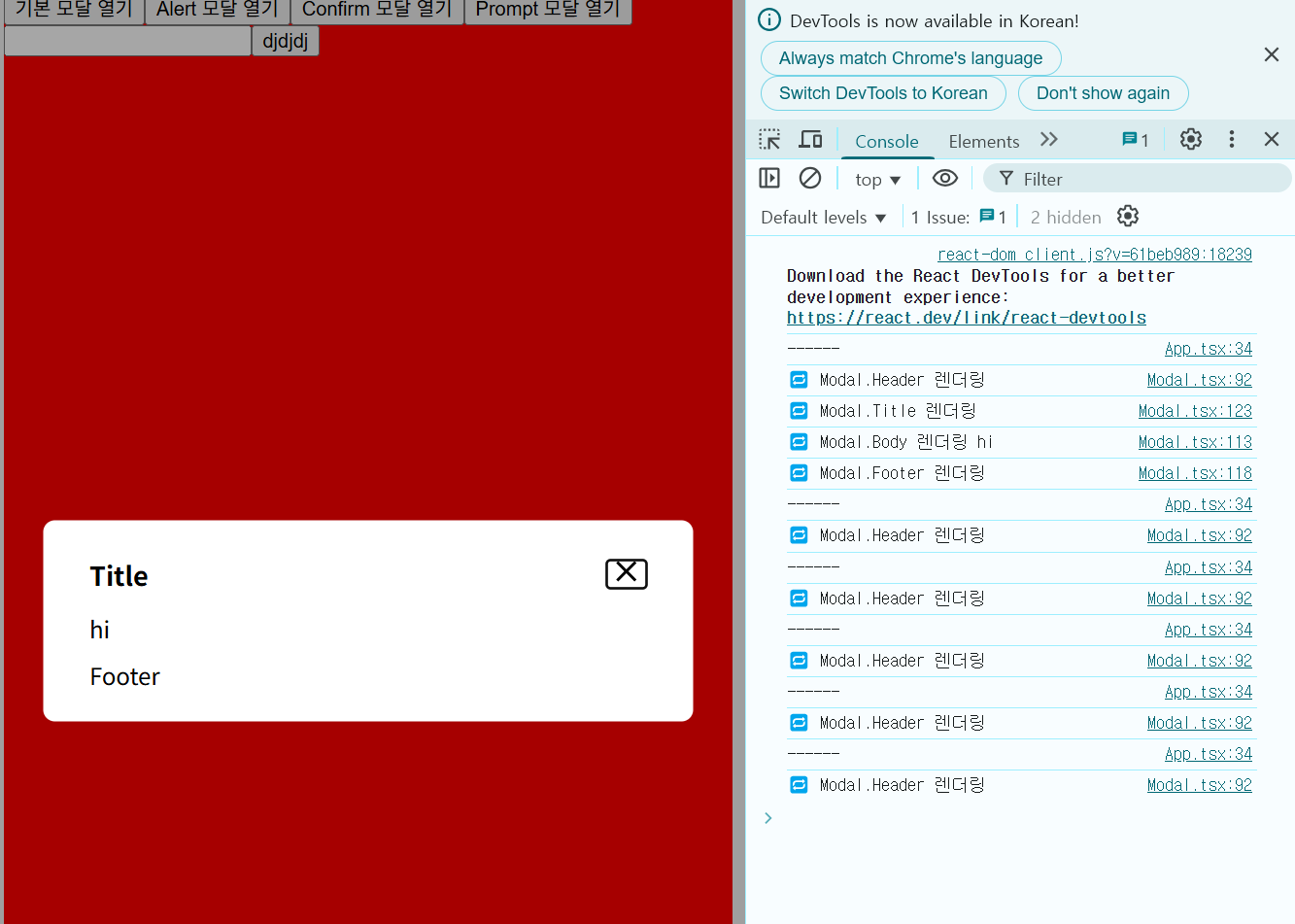그리고 이를 useContext로 구독하고 있는 Modal.Header는 value가 바뀌는 즉시 다시 렌더링된다.