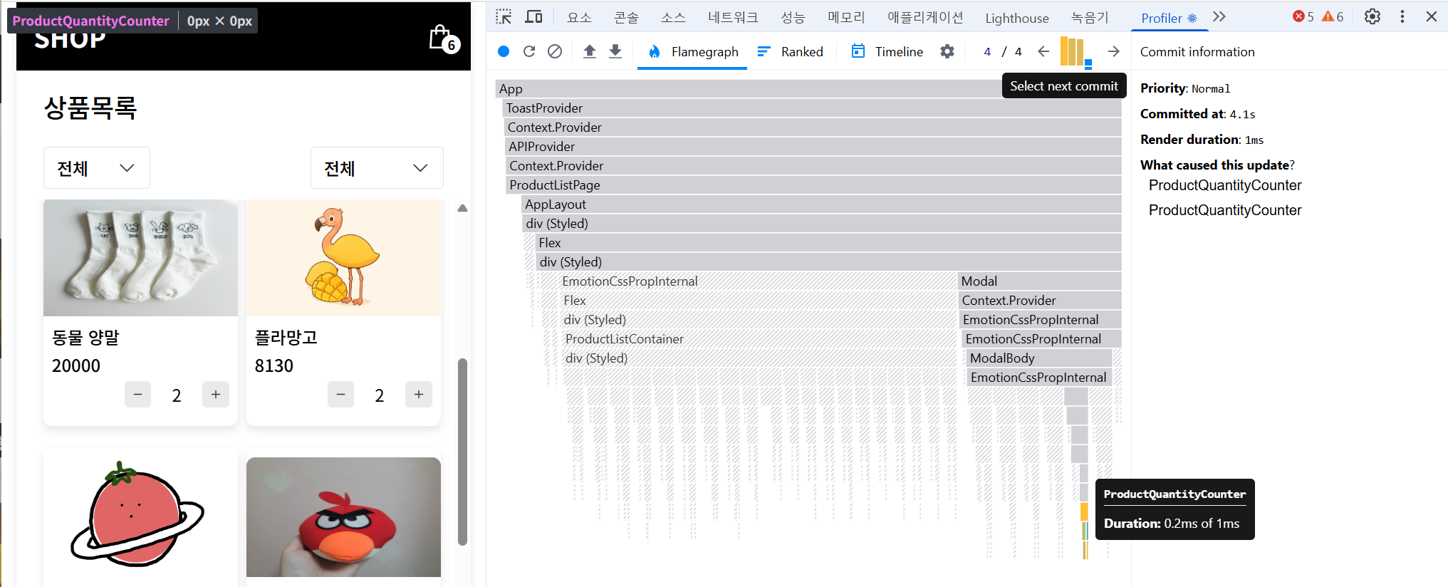위 이미지는 나는 아이템 의 수량을 늘리는 + 버튼을 클릭한 후 React Profiler의 Flamegraph 탭에서 캡처한 결과다.