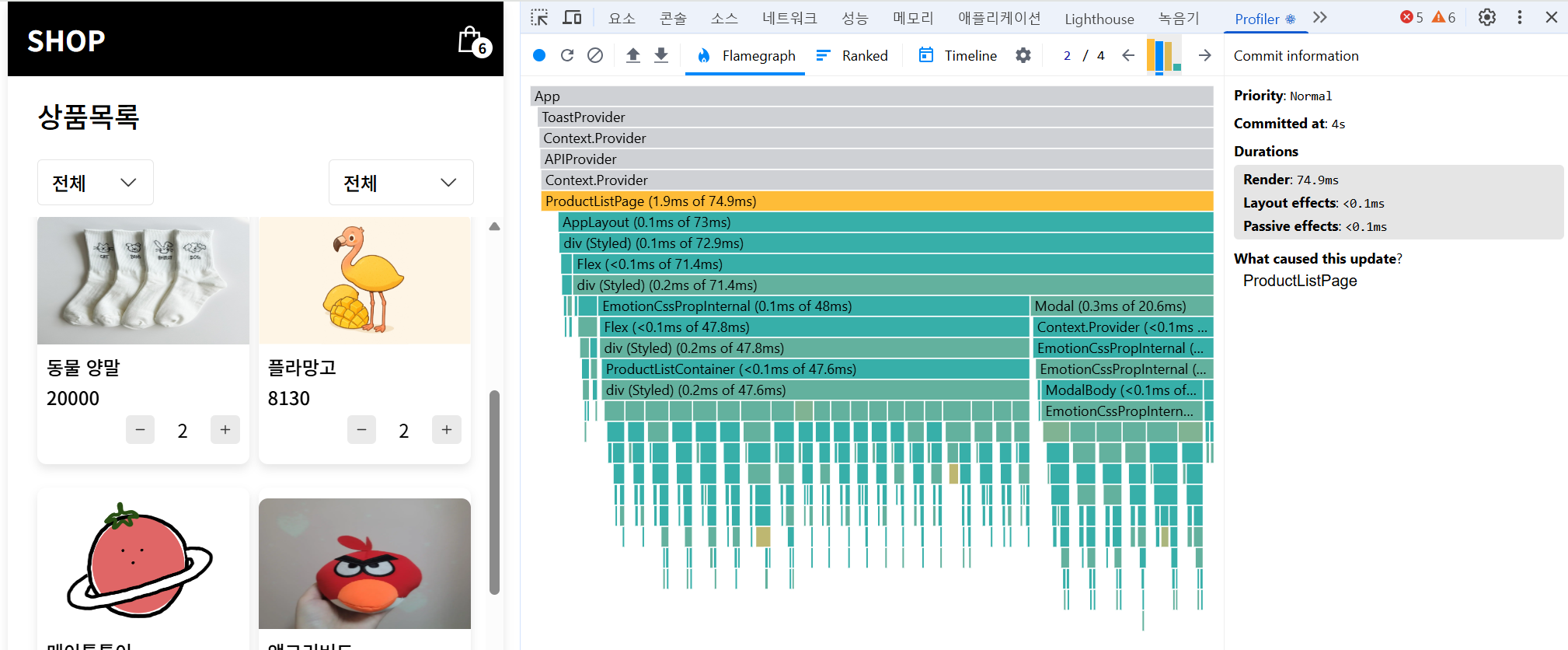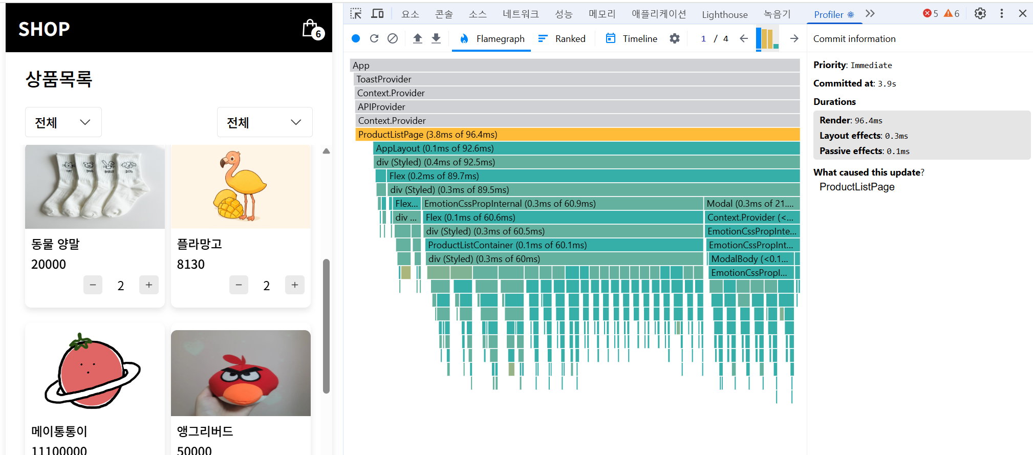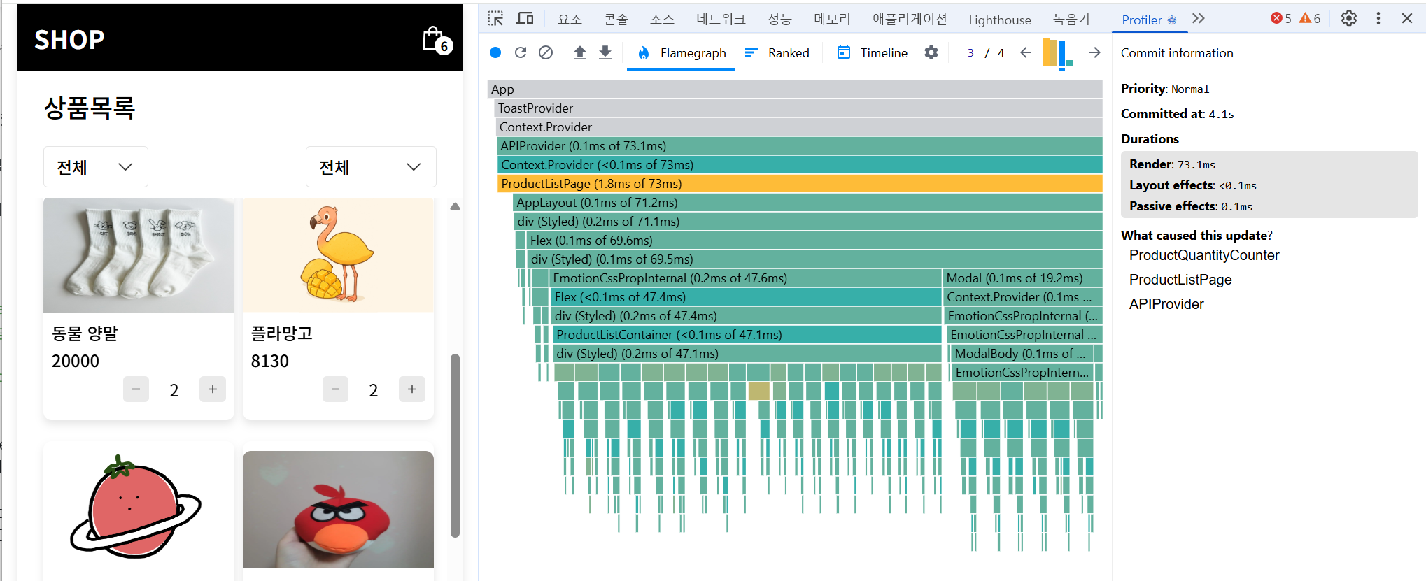 왼쪽은 UI 화면, 오른쪽은 실제 어떤 컴포넌트가 얼마나 렌더링되었는지를 보여주는 시각화 트리다.