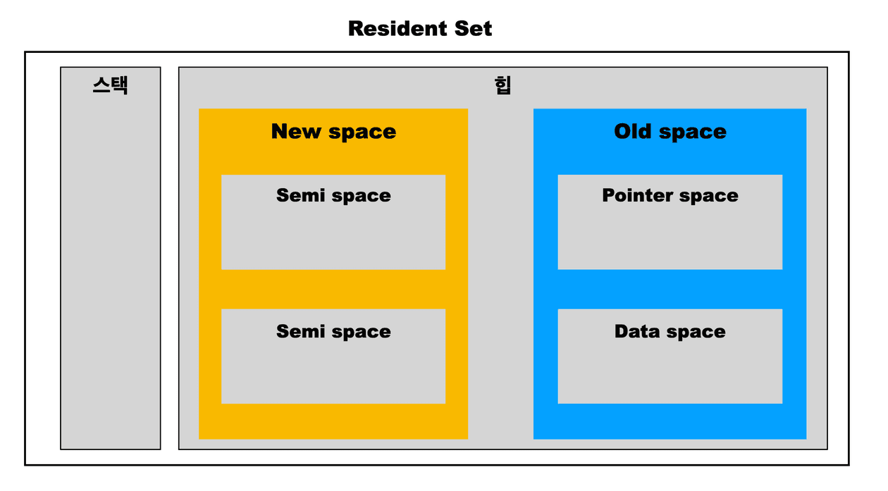 Resident Set은 스택 영역, 힙 영역으로 나뉘어지며 자바스크립트의 경우 싱글쓰레드라서 스택 메모리를 하나만 갖게 됨