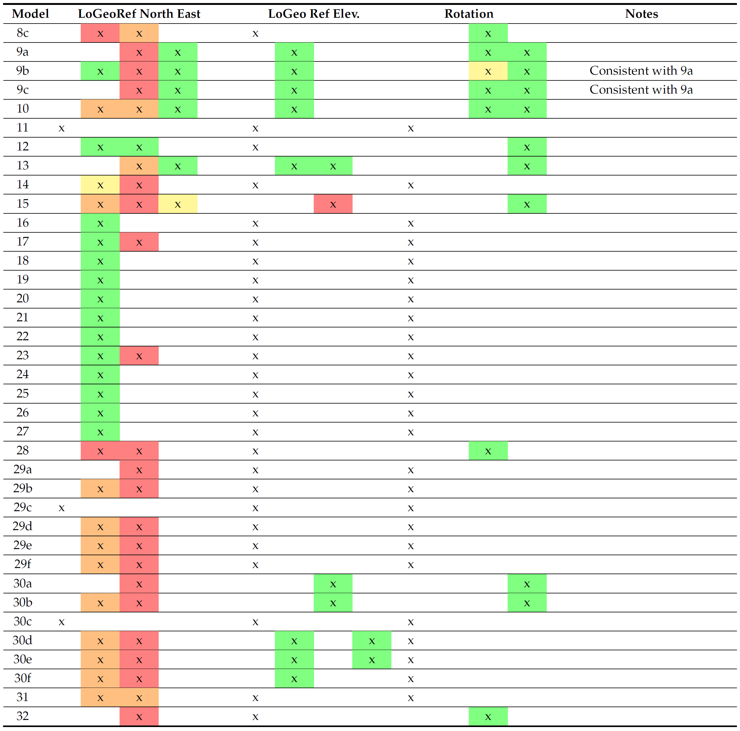 12% 모델의 경우 객체가 위치한 국가 안에서 랜덤으로 생성된 위치정보를 기반으로 매우 대략적으로 Georeferencing 정보가 포함되며, 해당 경우는 BIM SW 자체에서 발생한 것인지 혹은 디폴트 메타정보의 첨부에 따른 것인지 확인이 필요한 수준이다.