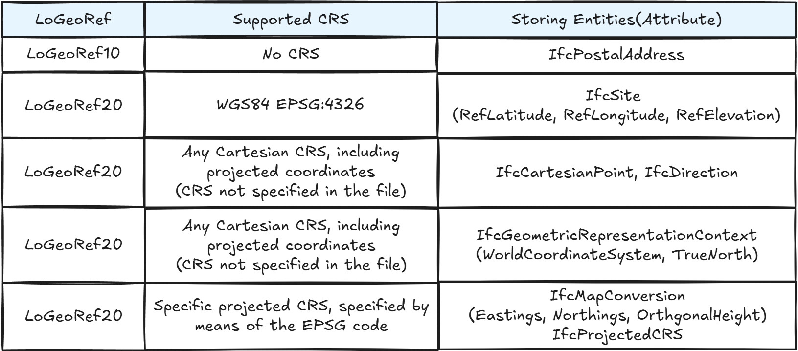 한 연구(Noardo et al.(2021), An Inspection of IFC Models from Practice)에서는 다양한 위치 정보에 따른 위치 정보 수준(Level Of Georeferencing)을 나누었다.