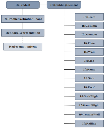 예로, 주요 엔티티(Entity)인 IfcProduct는 그 하위 엔티티인 IfcBuildingElement의 위치와 형상을 표현하는 기본적인 데이터 구조를 가지며, 그 하위 엔티티들인 IfcBeam, IfcColumn, IfcWall 등은 건물을 실제로 구성하는 지붕, 기둥 벽체 등을 표현하고 각 특성을 나타내는 속성정보들을 갖고 있다.