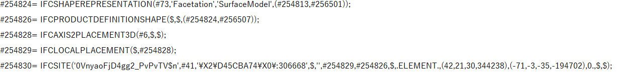 #254380의 IFCSITE가 갖고 있는 속성 정보들을 보면 #254829, #253826을 참조하고 있다.