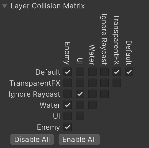 - 유니티에서는 Physics옵션의 Layer Collision Matrix에서 필요없는 부분을 제거하여 물리연산을 쉽게 최적화 할 수 있습니다.