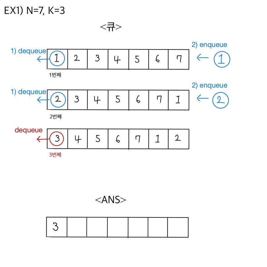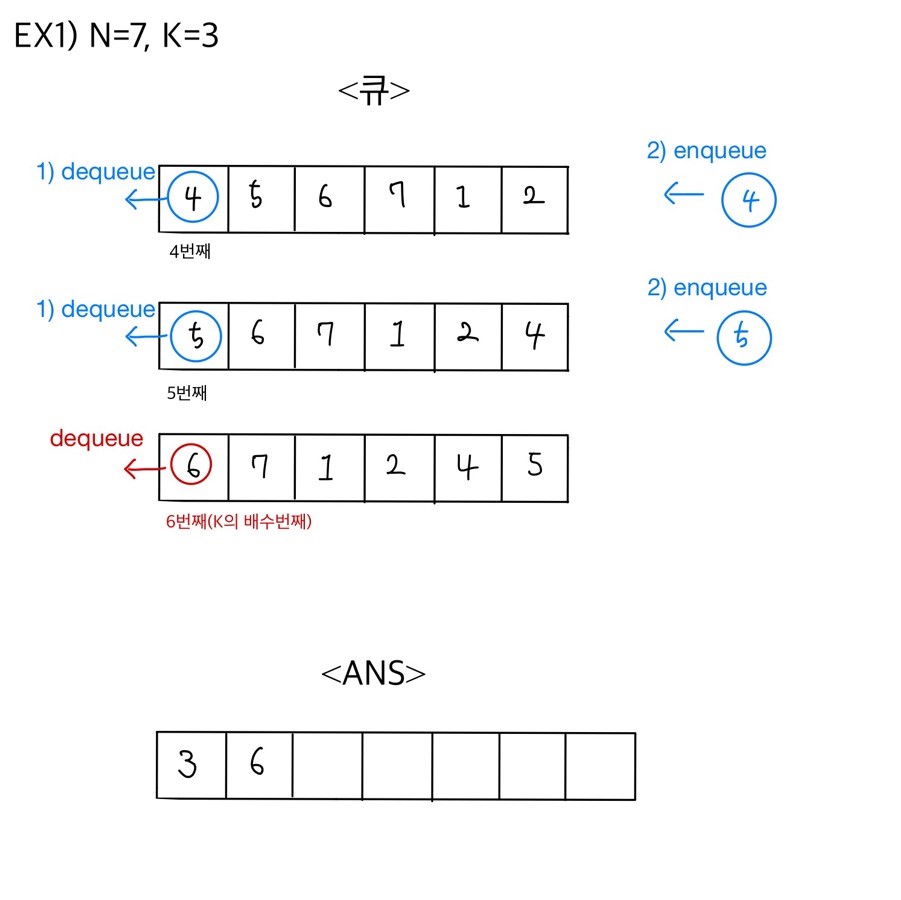 큐의 맨 앞 원소를 dequeue한 뒤에, 큐의 rear에 euqueue한다. 그러다가 k의 배수번째에 해당하면 원소를 dequeue한다. 이 때