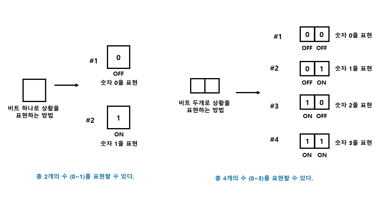 그래서 불이 켜지고(1) 꺼지는(0) 상황을 비트로 표현하게 된다.