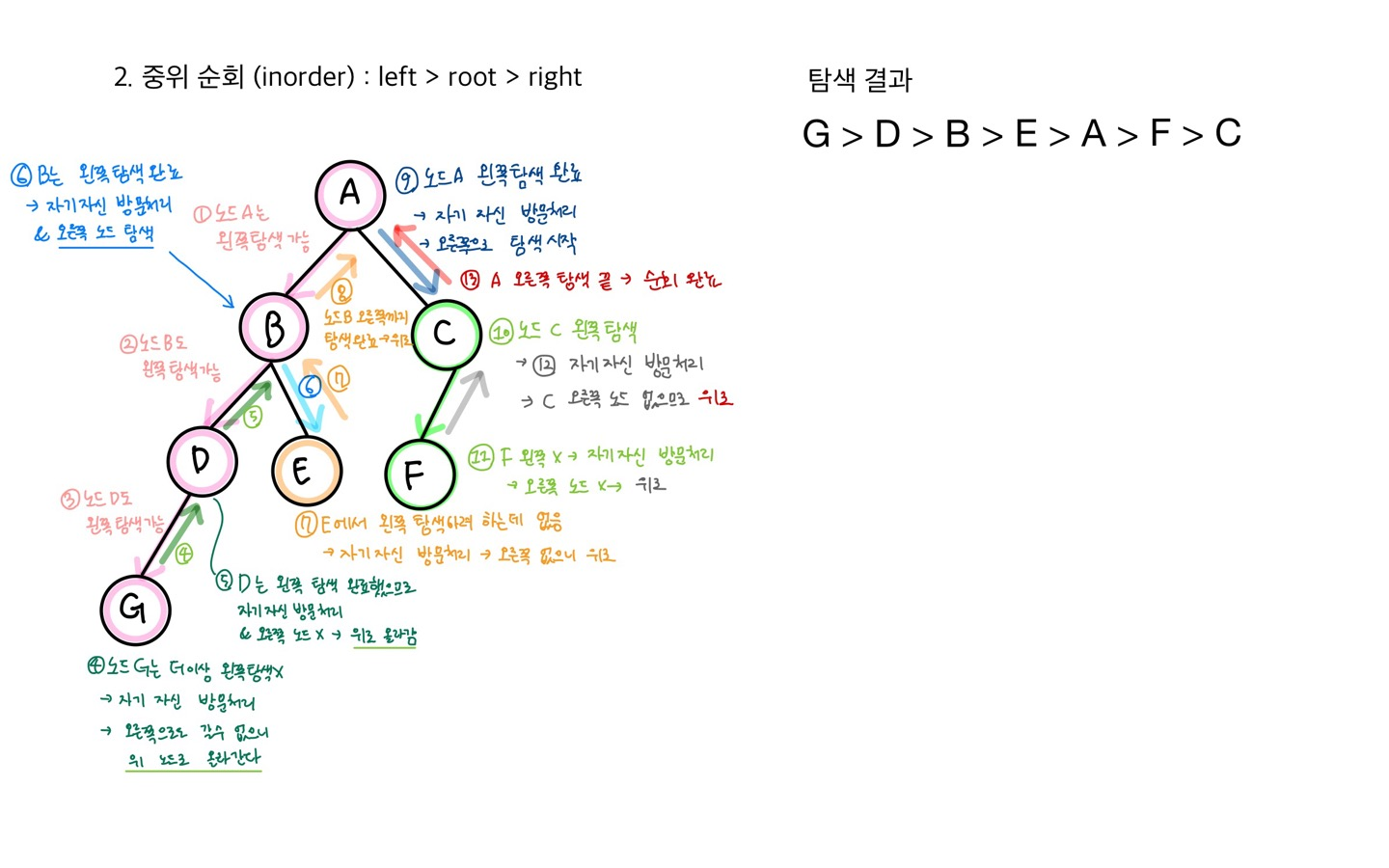 중위 순회는 일단 left node먼저 탐색하고, 그 다음에 root node를 방문처리하고, right node를 탐색해나가는 과정이다.