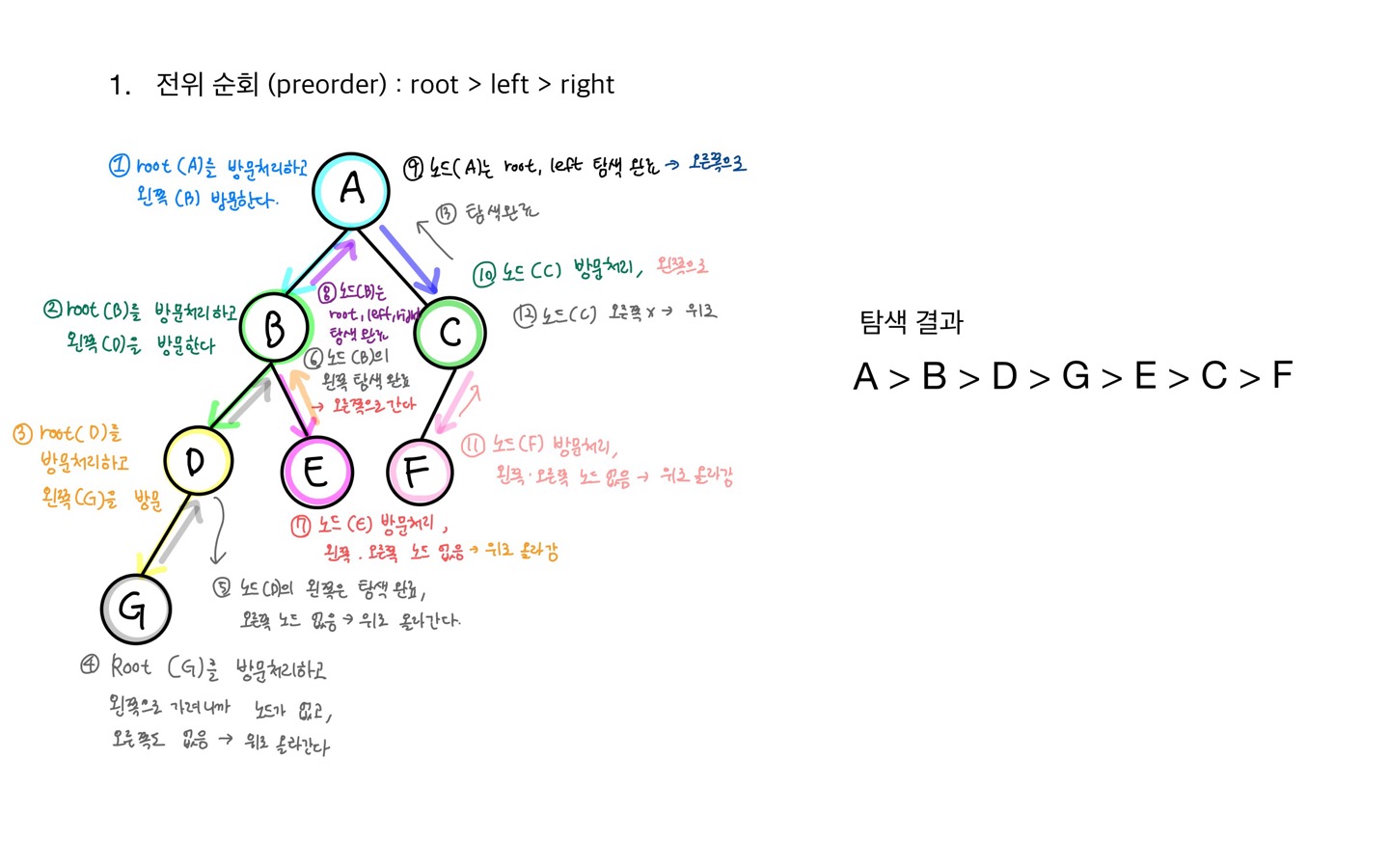 트리구조에서 데이터(노드)를 방문하는 과정을 트리 순회라고 하며, 그 방법에는 전위 순회(preorder), 중위순회(inorder), 후위 순회(postorder) 세 가지가 있다.