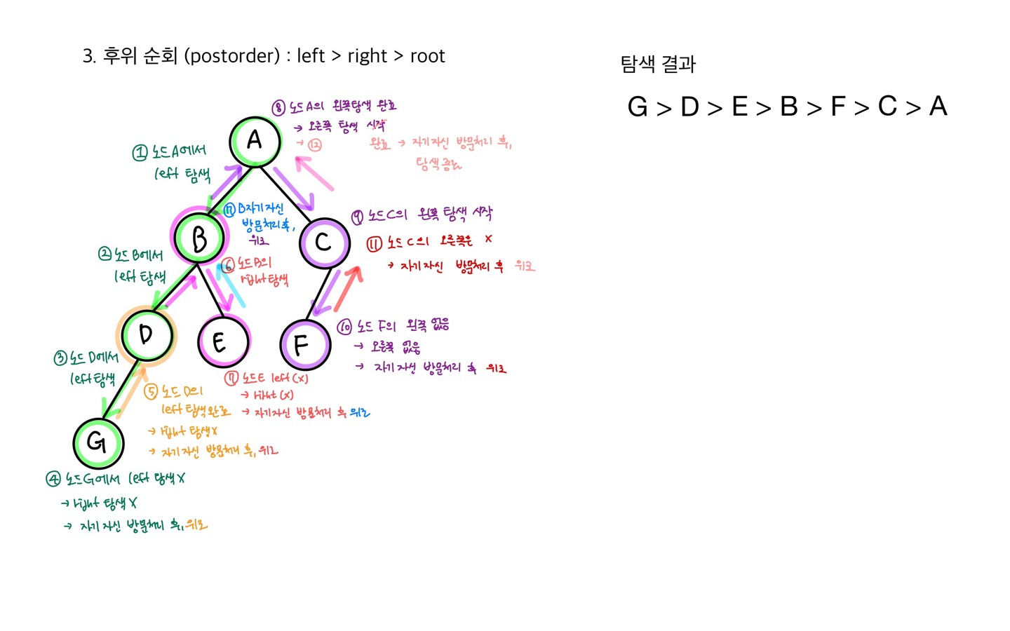 후위 순회는 left node먼저 탐색, 그 다음 right node 탐색, 마지막에 root node를 방문처리 하며 탐색하는 과정이다.