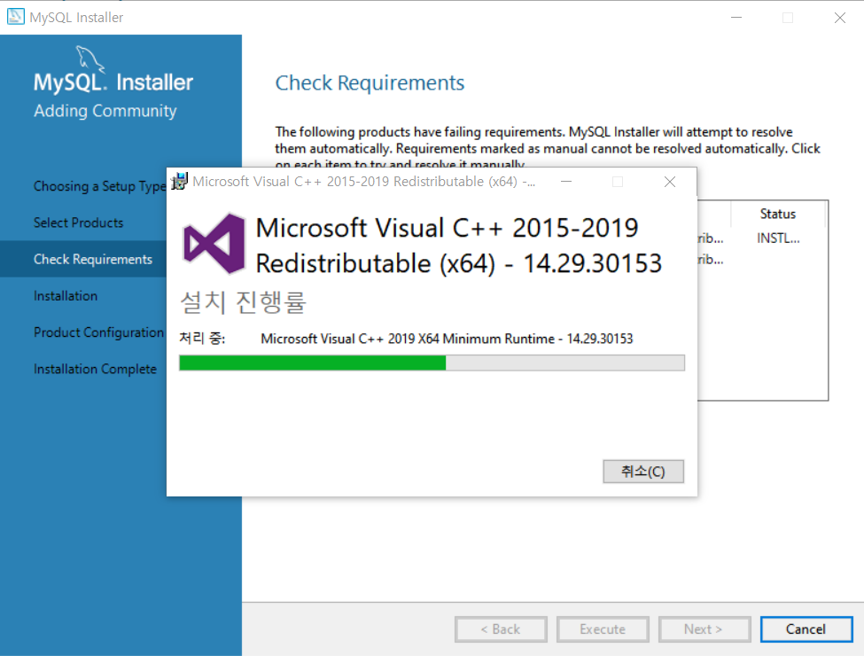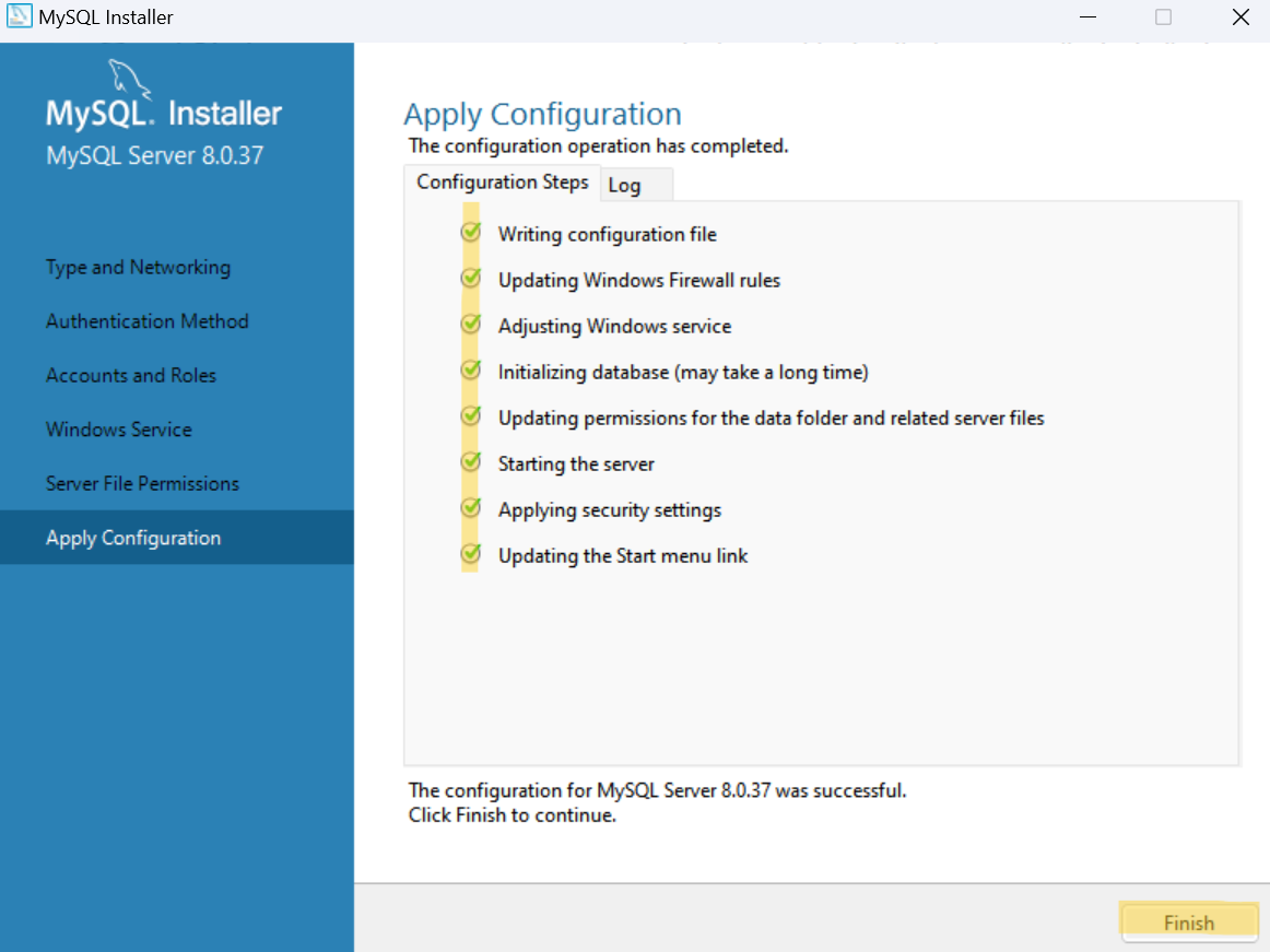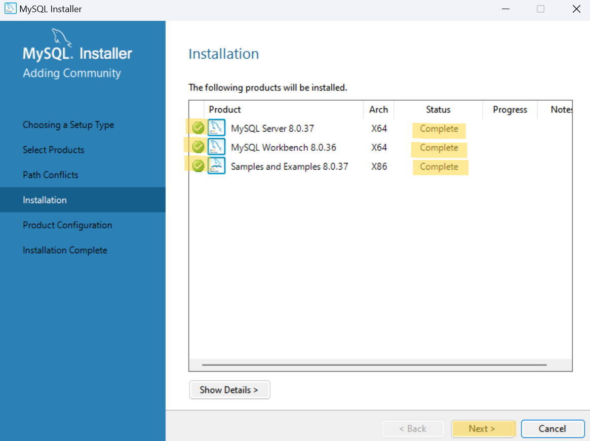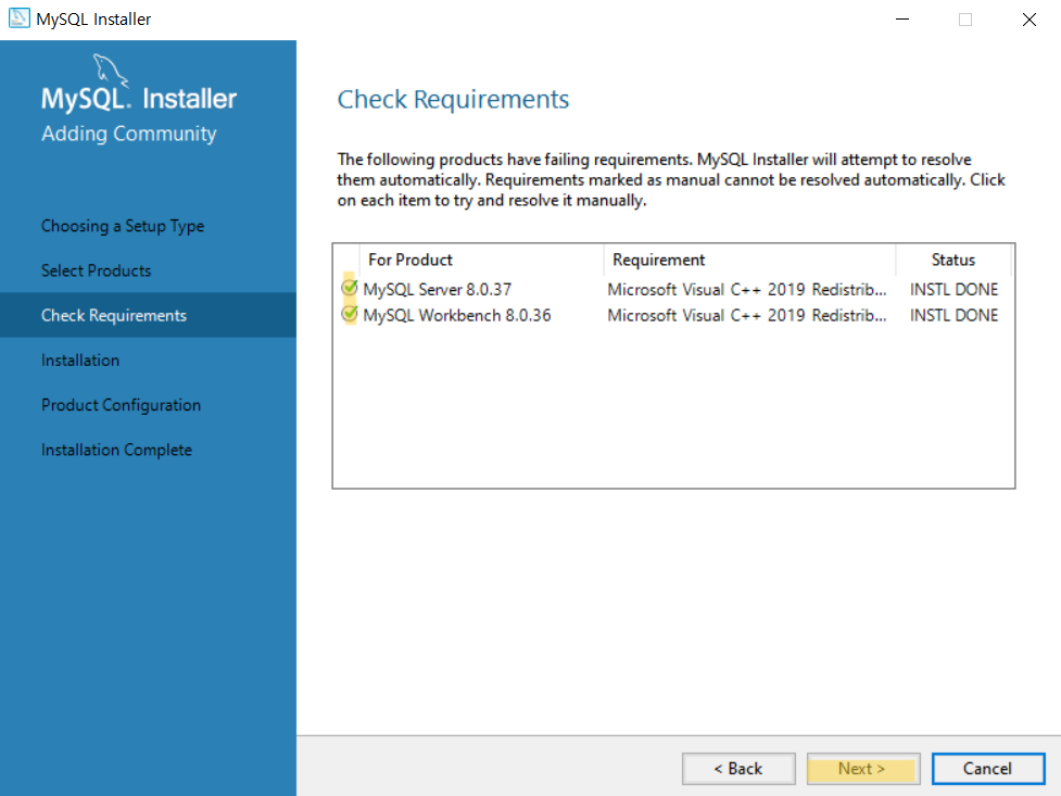 MySQL Server에 대한 환경설정이 완료되면 모든 항목 왼쪽에 초록색 체크가 생긴다.