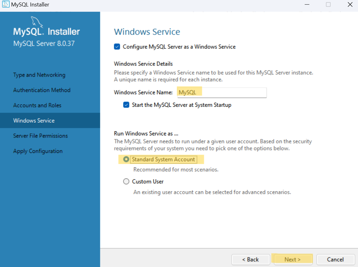 Windows Service Name을 MySQL로 설정하고 Standard System Account 선택 후