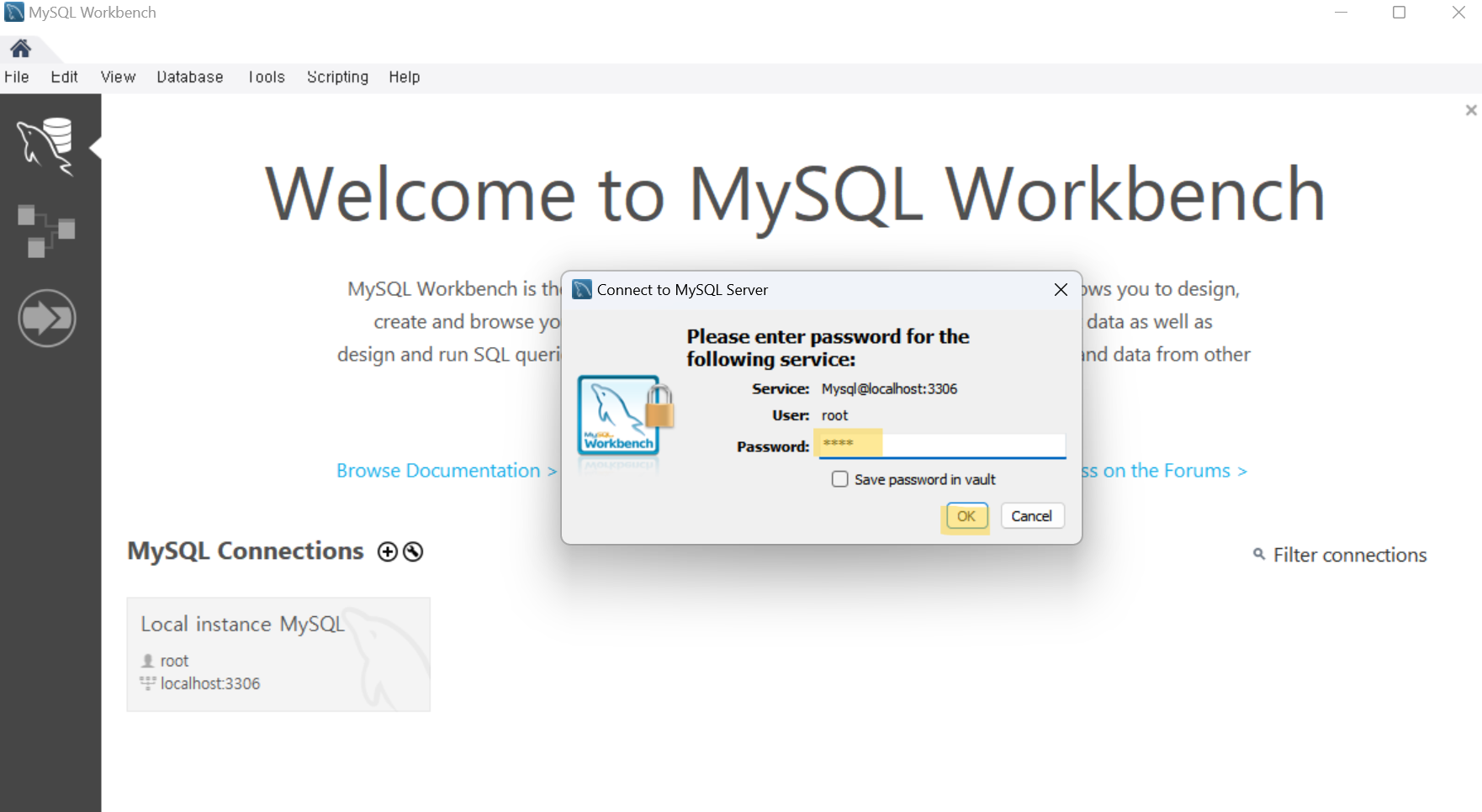 설정했던 root(관리자) 비밀번호 입력후 OK