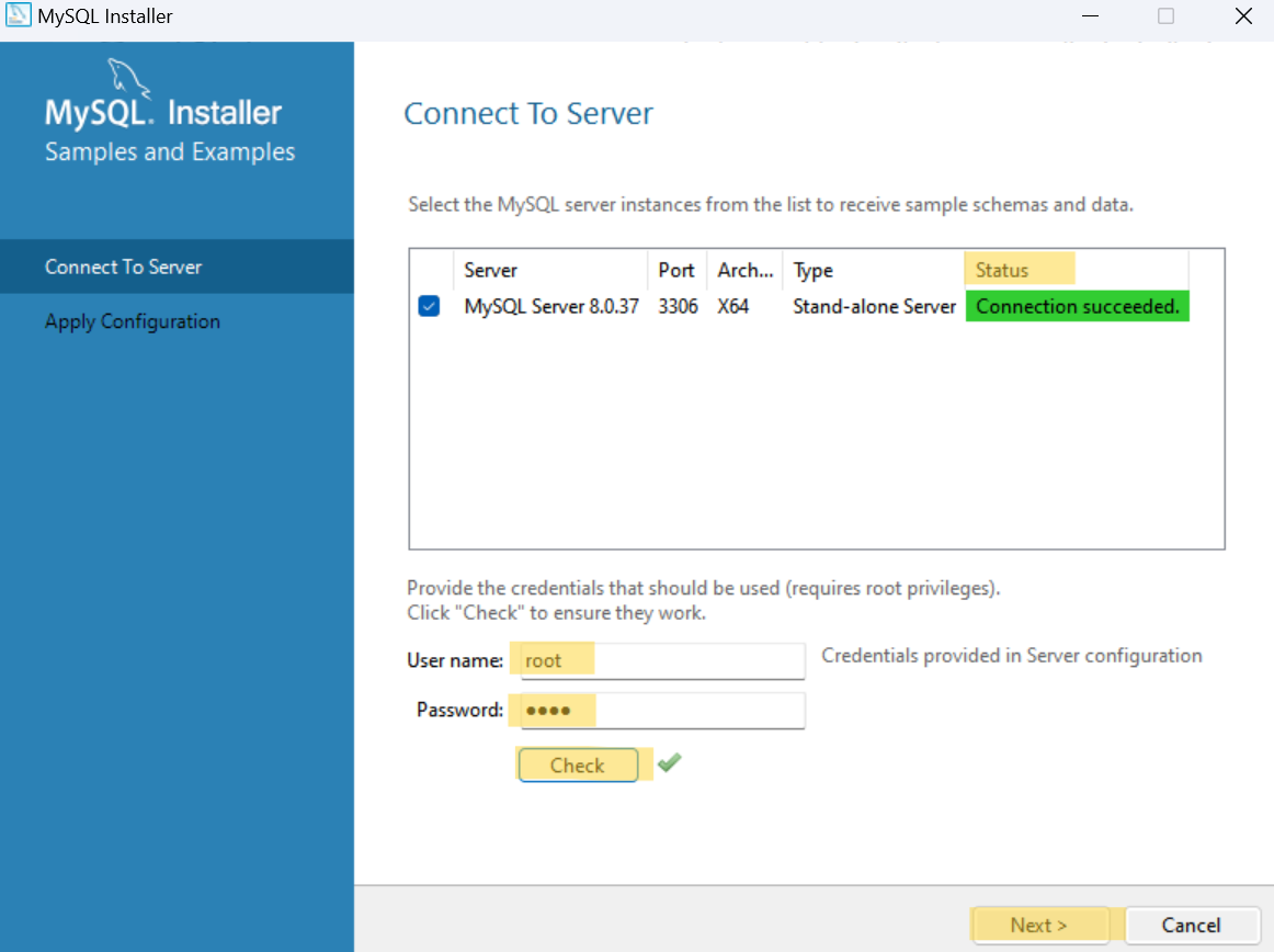앞에서 설정한 Root(관리자) 비밀번호 입력 후 Check 클릭 하기 성공적으로 연결되면 Status에 초록색과 함께 Connection succeeded가 생긴다.
