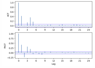 이 경우 ACF와 PACF를 살펴보면, ACF를 4를 주기로 점점 감소하고, PACF도 4를 주기로 점점 감소한다.