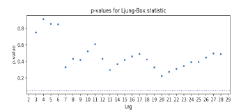 대부분의 p-value가 0.05보다 크다면 잔차 간 자기상관이 없다고 확인한다.
