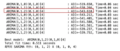 가능한 (p, q) 및 (P, Q) 조합 중 AIC가 최소화되는 모델을 찾아준다.