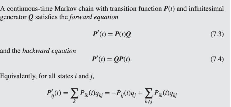 - 연속시간 마르코프 체인(CTMC)에서 transition function P(t)의 변화율 = rate of change을 분석하는 것이 중요함.