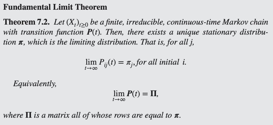 Let (Xt)t≥0 be a finite, irreducible, continuous-time Markov chain with transition function P(t). Then, there exists a unique stationary distribution π, which is the limiting distribution. That is, for all j,