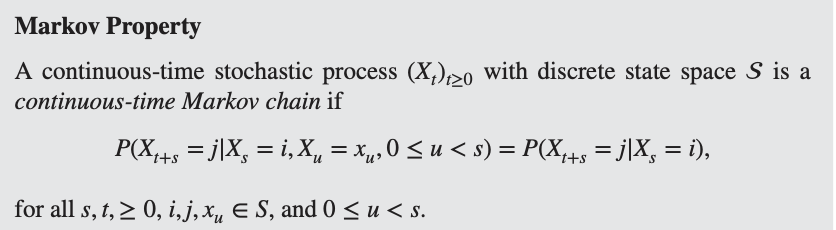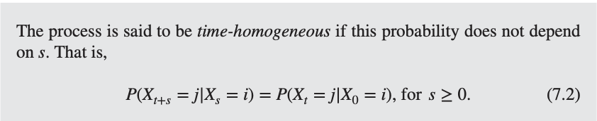 연속시간 마르코프 체인은 보통 시간-동질적(Time-Homogeneous)입니다. 즉, 전이 확률이 시간에 따라 변하지 않는다는 의미입니다. 시작 시점인 s에 의존하지 않는다.