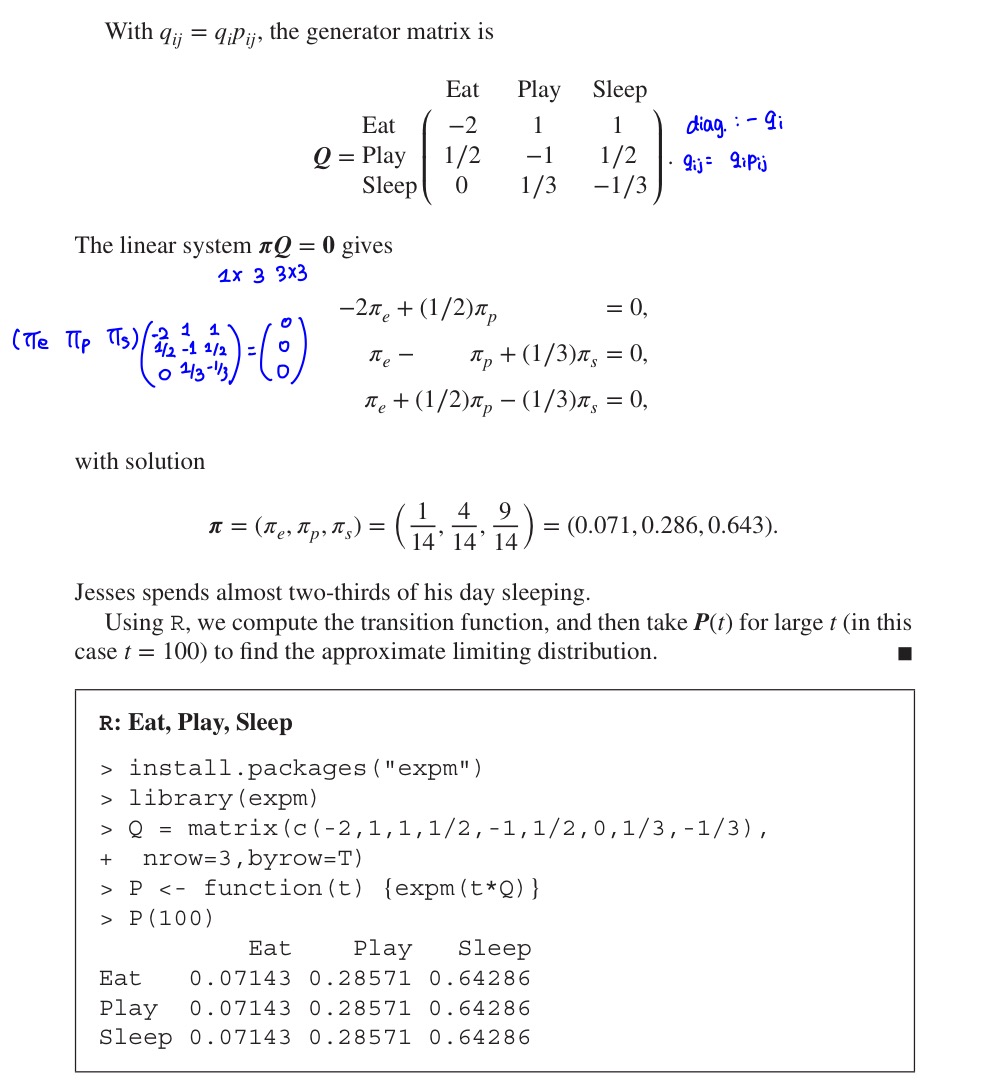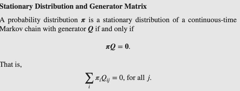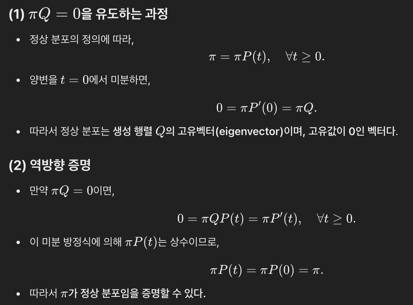 - 정상 상태에서는 각 상태에서 나가는 전이율과 들어오는 전이율이 같아야 하므로 πQ=0이 성립한다.