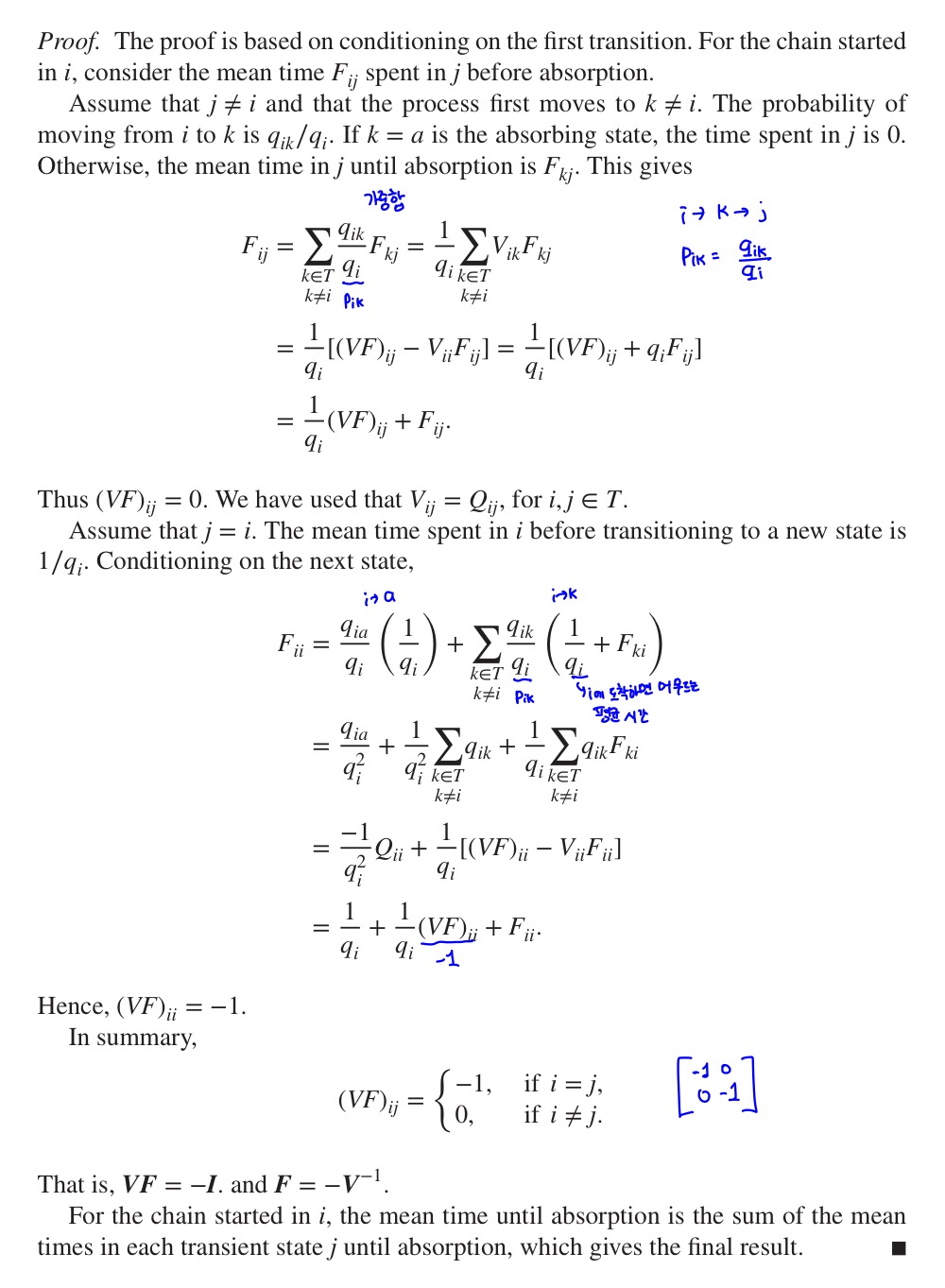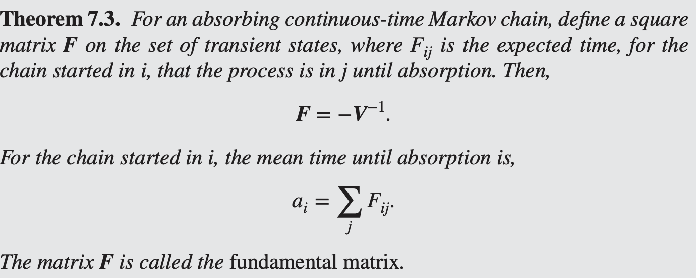 - V는 transient 상태들 사이에서 전이율을 나타내므로, 이 행렬의 역행렬을 취하면 각 상태에서 보내는 평균 시간이 된다. 음수 부호는 전이율이 음수로 표현되기 때문