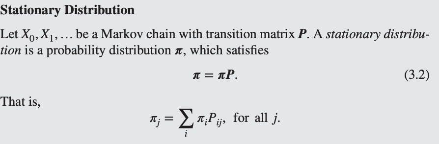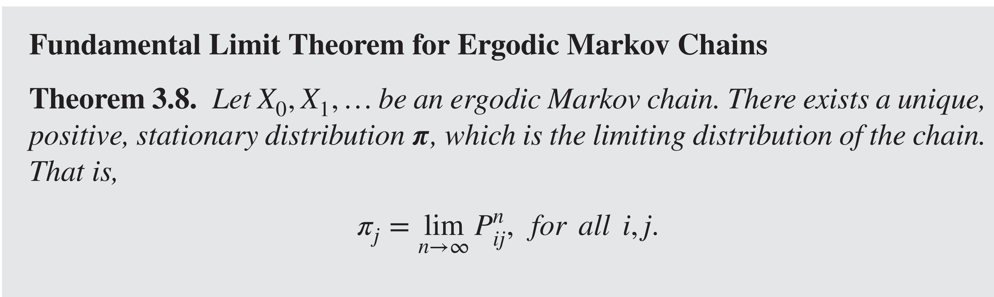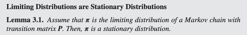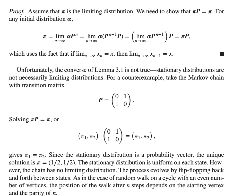 - however, converse is not necessarily true. 어떤 마르코프 연쇄에서는 정상 분포는 존재하지만, 시간이 무한히 지나도 극한 분포로 수렴하지 않을 수도 있다.
