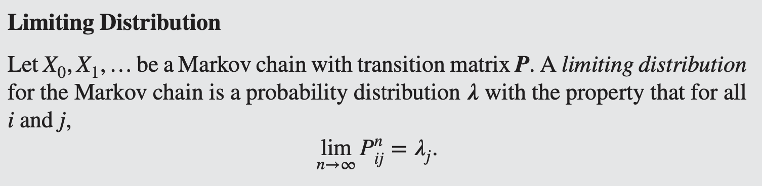 A **limiting distribution** for the Markov chain is a probability distribution $\lambda$ with the property that for all i and j,