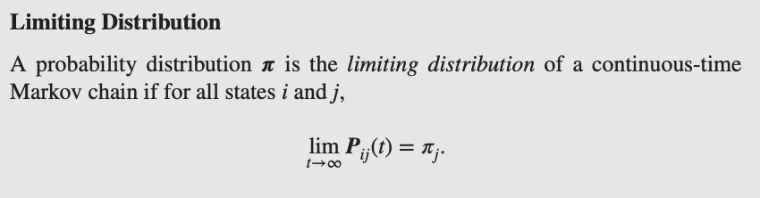 A probability distribution π is the limiting distribution of a continuous-time Markov chain if for all states i and j,