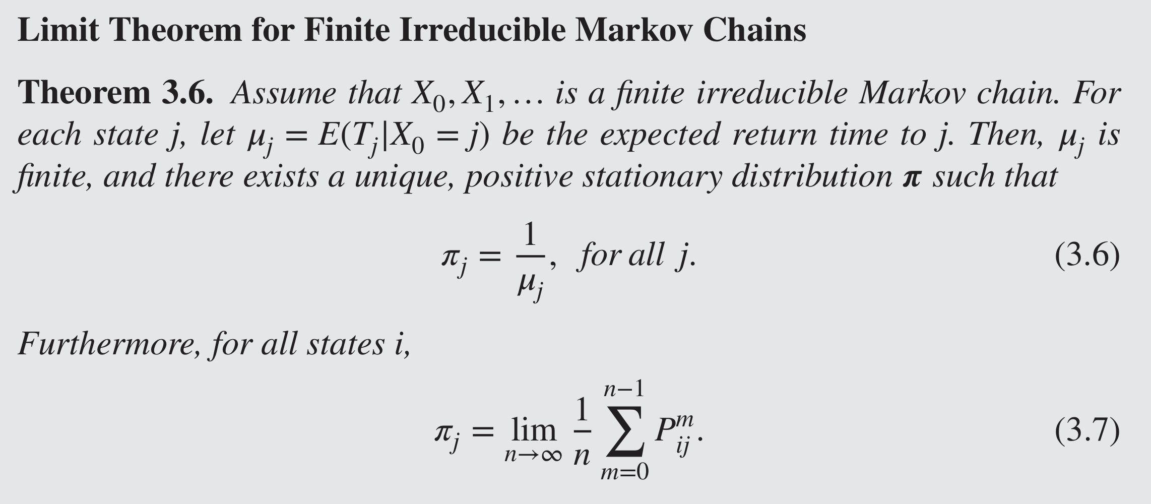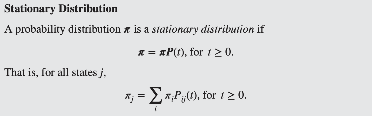 - 초기 상태 i가 무엇이든 간에 시간 t가 충분히 크면 상태 j에 있을 확률이 특정 값 πj로 수렴해야 한다.
