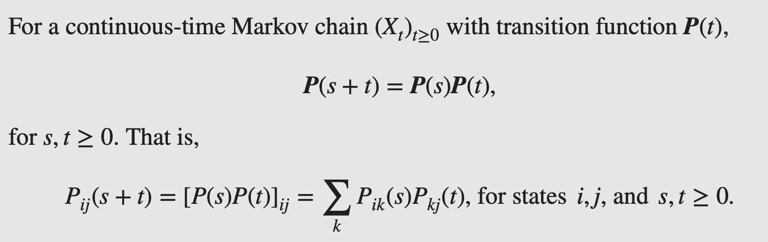 - transition matrix for a discrete-time Markov chain과 비슷한 properties를 갖는다 → Chapman-Kolmogorov Equation