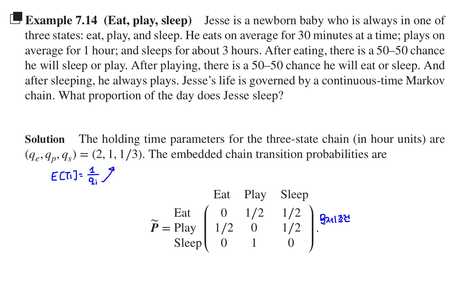 즉, 각 상태에서 평균 1/qi시간 동안 머무르고, pij확률로 다음 상태로 이동하는 과정이 무한히 반복됨.