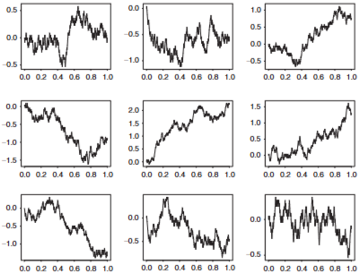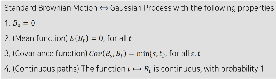 A Gaussian process ( X t ) t ≥ 0 (X_t)_{t≥0} ( X t ) t ≥ 0 는 모든 n = 1 , 2 … n=1,2… n = 1 , 2 … 에 대해 0 ≤ t 1 < ⋅ ⋅ ⋅ < t n 0 ≤ t_1 < · · · < t_n 0 ≤ t 1 < ⋅ ⋅ ⋅ < t n 를 만족하는 경우 R.V X t 1 … X t n X_{t1}… X_{tn} X t 1 … X t n 이 다변량 정규분포를 따르는 Continuous time stochastic process 임.