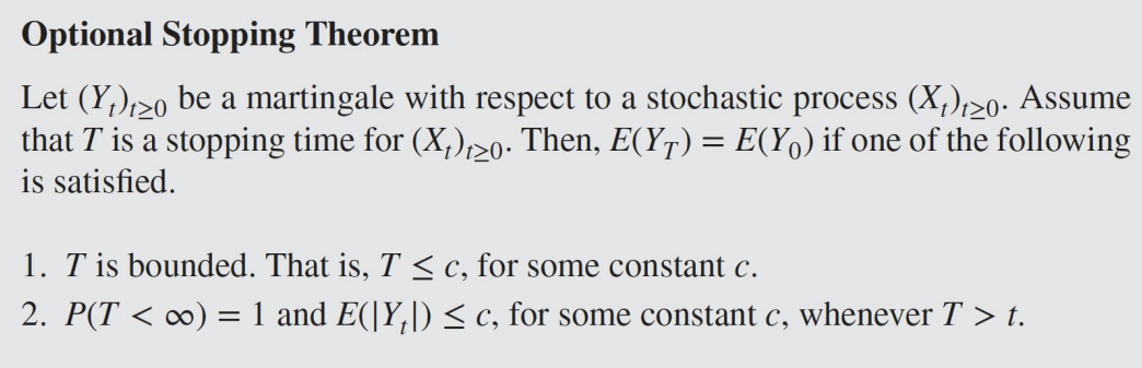 E [ Y t ] = 1 ≠ 0 = E [ Y 0 ] E[Y_t]=1\neq0=E[Y_0] E [ Y t ] = 1 = 0 = E [ Y 0 ] 이므로 Optional Stopping Theorem에 만족하지 않음