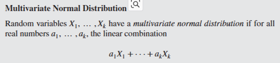 이런 선형조합이 정규분포를 따르면, 확률변수열 X 1 … X k X_1…X_k X 1 … X k 는 다변량 정규분포를 가짐.