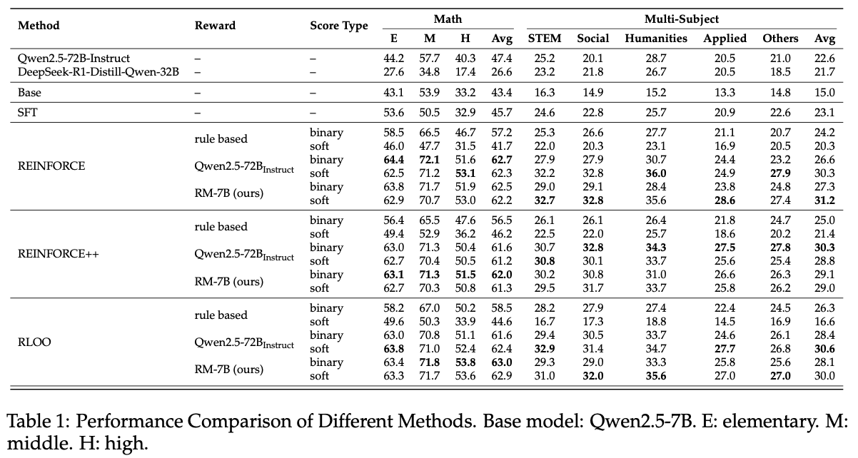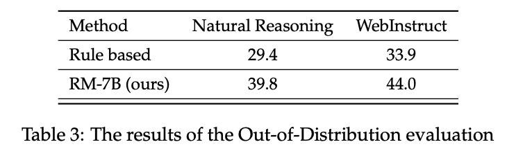 -> 도메인별 데이터에 대해 광범위한 주석 없이도, 상대적으로 작은 크기(7B)의 LLM을 사용해 도메인 전반에 걸쳐 사용할 수 있는 보상 모델을 학습하는 것이 가능함을 실험을 통해 입증