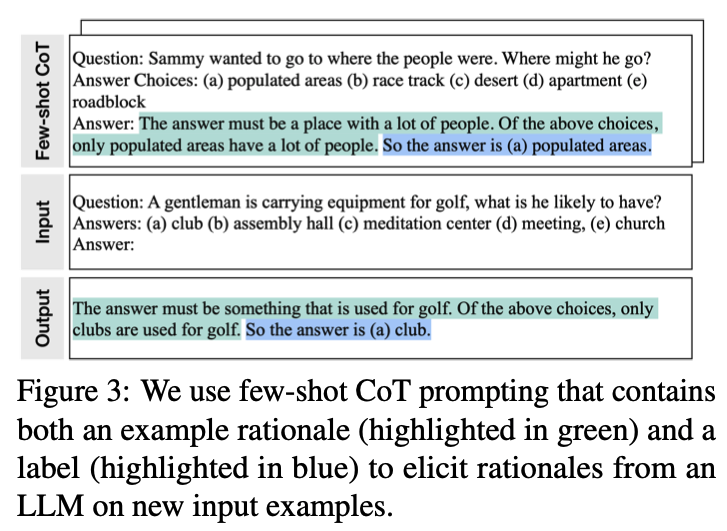 unlabeled 데이터셋이 주어졌을 때, LLM에게 출력 라벨과 함께 해당 라벨을 정당화하는 추론 과정을 생성하도록 프롬프트 설계