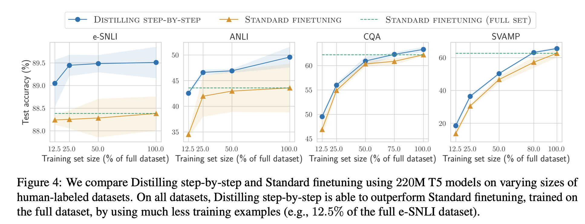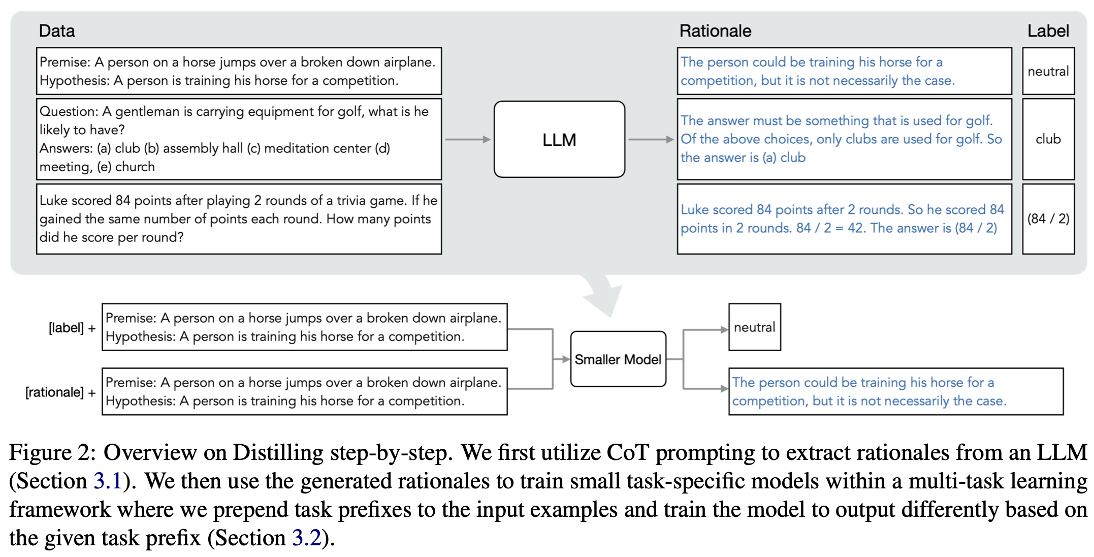 - distilling step-by-step: 문제 풀이 과정을 학습하여 적은 문제만 풀어도 효율적으로 성능 향상 가능